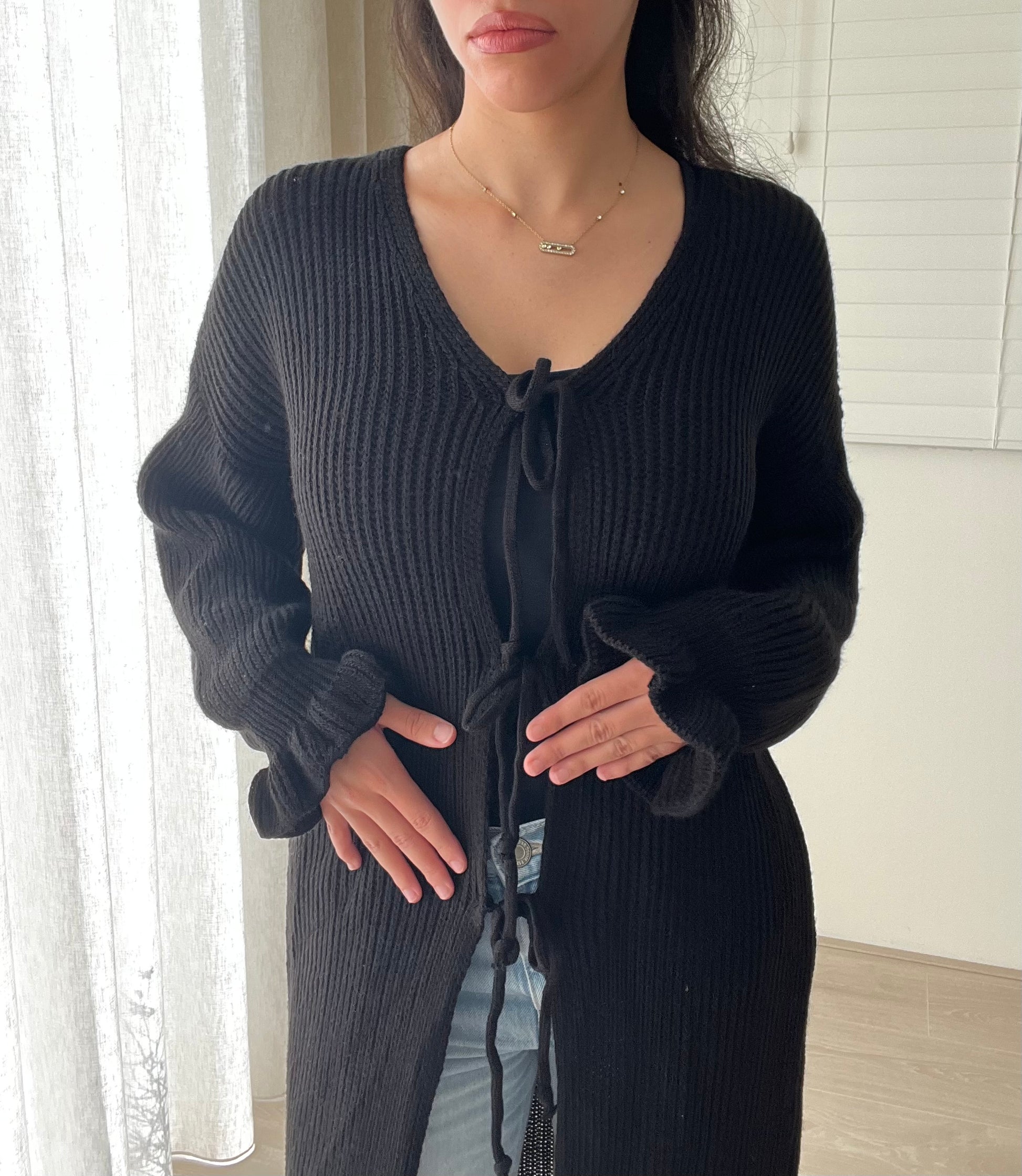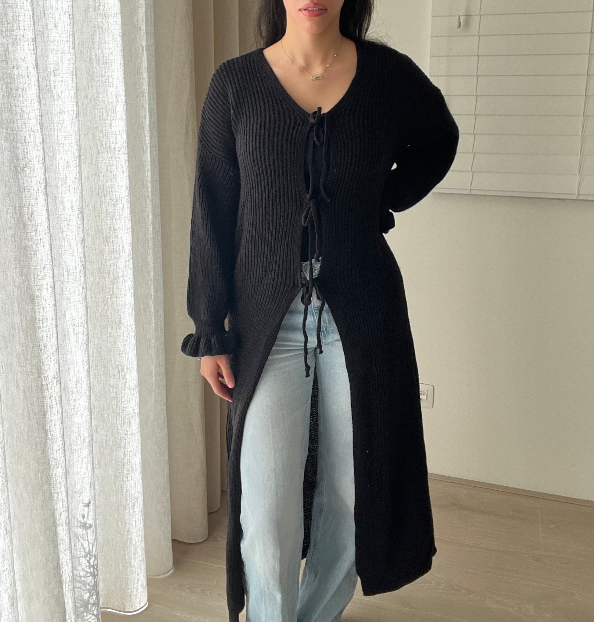 This elegant long vest in Kuro (Black) features three delicate front ties, adding a charming and feminine touch. Perfect to layer over an abaya, a dress, or casual outfits for a chic, effortless look.